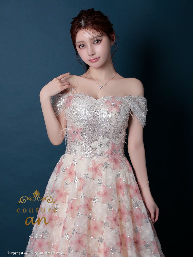キャバドレス couture an クチュール アン 高級 オフショルダー 半袖 フラワー スパンコール ラメ バースデー 袖取り外し可能 Aライン キャバドレス