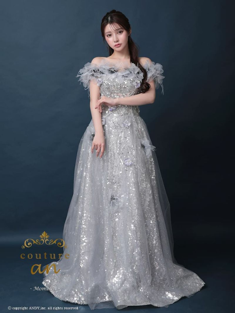 抜群の存在感を放つロングドレス☆ [couture an/クチュールアン] 高級 バースデー オフショルダー 半袖 フラワー ビジュー ラメスパンコール Aラインロングドレス
