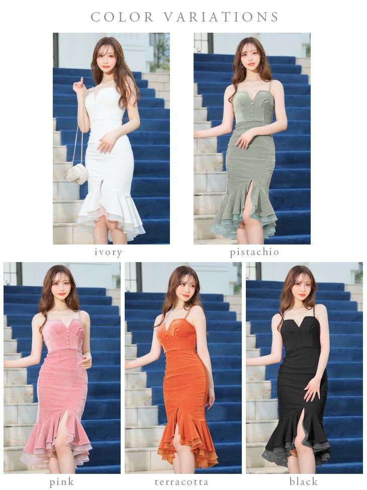 キャバドレス 膝丈ドレス [DEA.byROBEdeFLEURS/ディアバイローブドフルール]  高級スエードキャミソールフロントボタンフリルテールマーメイドタイト膝丈ドレス