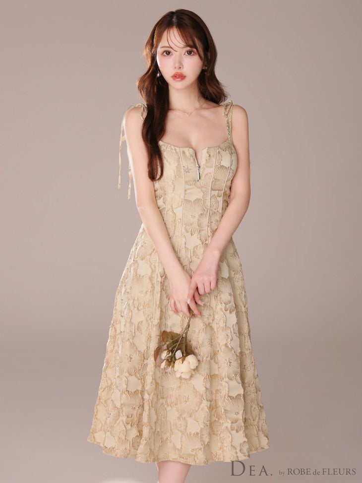 5. [DEA.byROBEdeFLEURS/ディアバイローブドフルール] 高級花柄ジャガードショルダーリボンキャミソールジップフレア膝丈ドレス