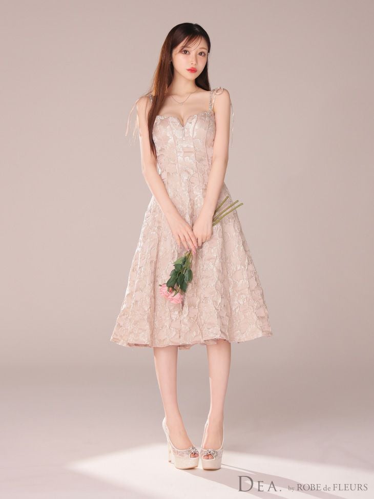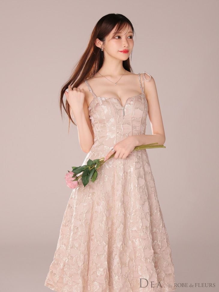 大人の上品さを演出☆ [DEA.byROBEdeFLEURS/ディアバイローブドフルール] 高級花柄ジャガードショルダーリボンキャミソールジップフレア膝丈ドレス
