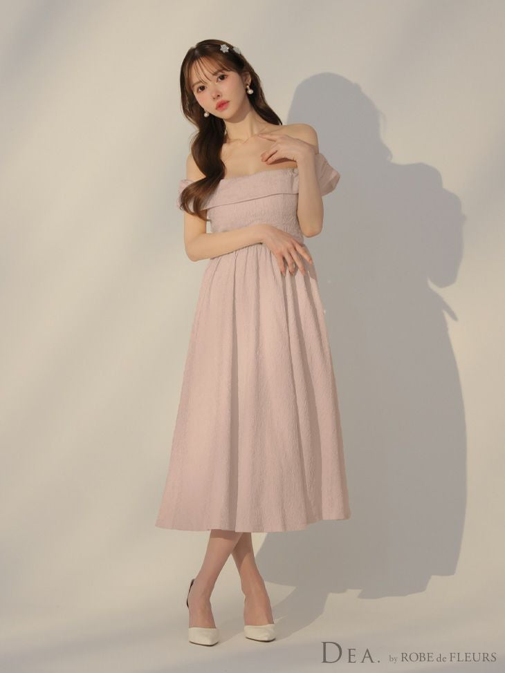 後ろ姿も抜かりのない可愛さ♡ [DEA.byROBEdeFLEURS/ディアバイローブドフルール] 高級 ジャガード バックリボン ウエストベルト オフショルダー Aライン 膝丈ドレス