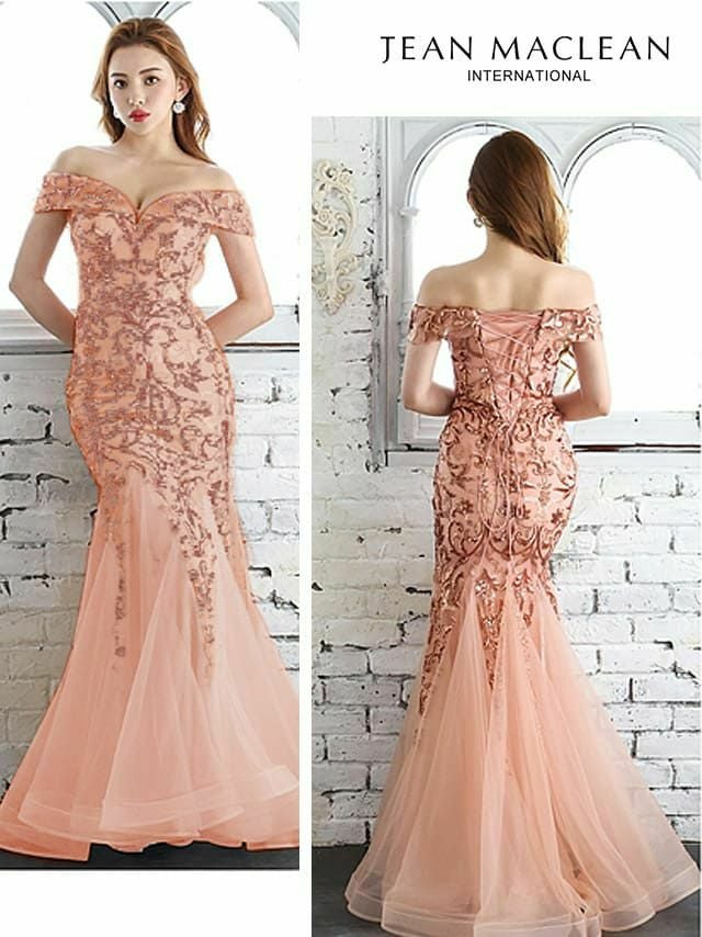 4. [JEANMACLEAN/ジャンマクレーン] 高級刺繍スパンコールデザインバックレースアップチュールマーメイドオフショルダーロングドレス