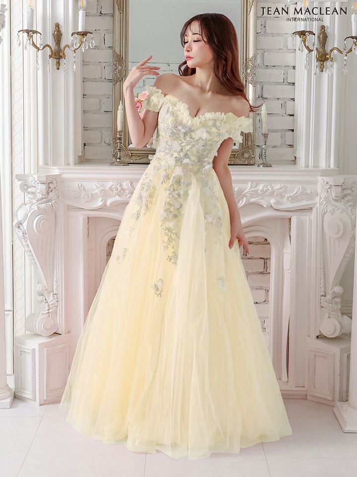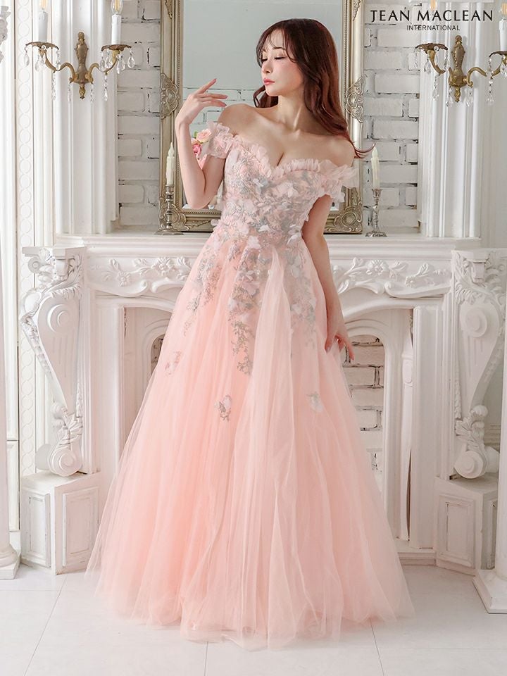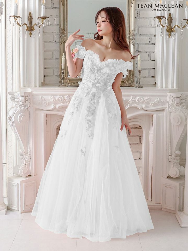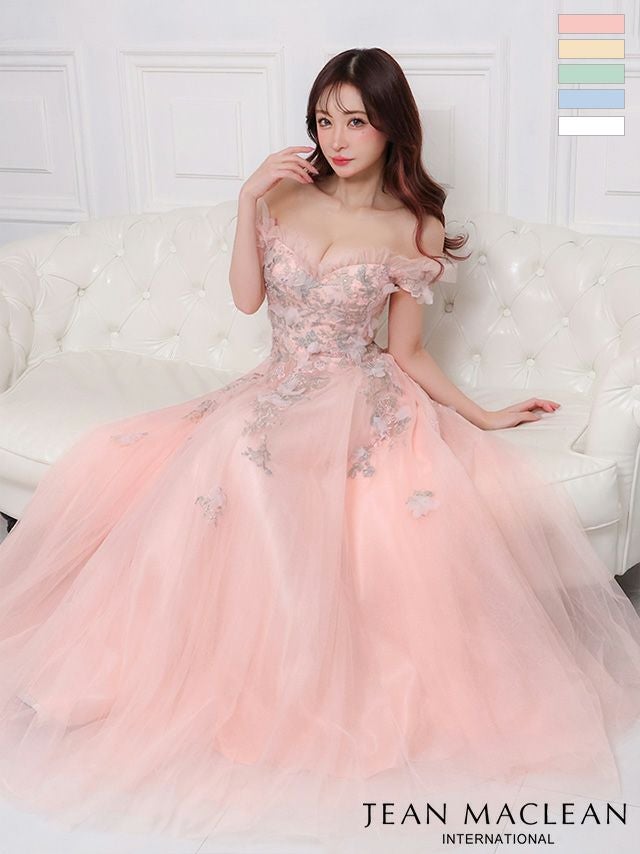 主役級の可愛さを放つ☆ [JEANMACLEAN/ジャンマクレーン] 高級 バースデーオフショルダー胸元フリルフラワー刺繍チュールAラインロングドレス