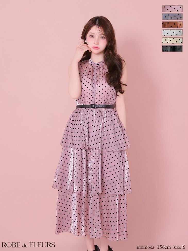 3. [ROBEdeFLEURS/ローブドフルール] 高級 ブランド Aラインロングドレス ノースリーブ ドット柄 ウエストベルト オーガンジー エレガント