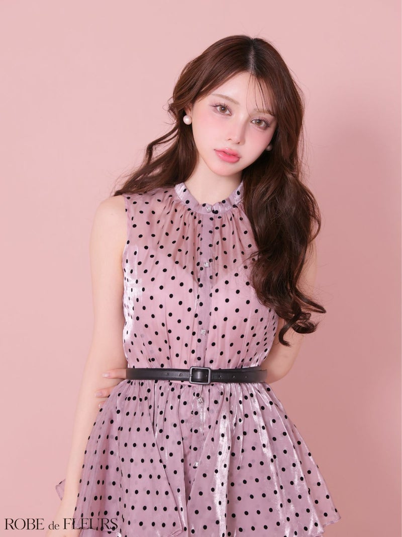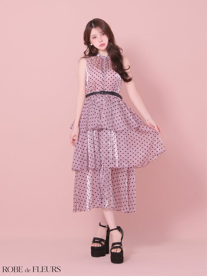 ガーリーさの中にも上品さ溢れる♡ [ROBEdeFLEURS/ローブドフルール] 高級 ブランド Aラインロングドレス ノースリーブ ドット柄 ウエストベルト オーガンジー エレガント