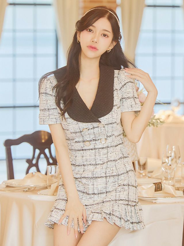 上品ガーリーなスタイルをメイク☆ [JENNNY/ジェニー] チェック柄 ツイード 襟付き ボックスプリーツ 半袖 フレアミニドレス