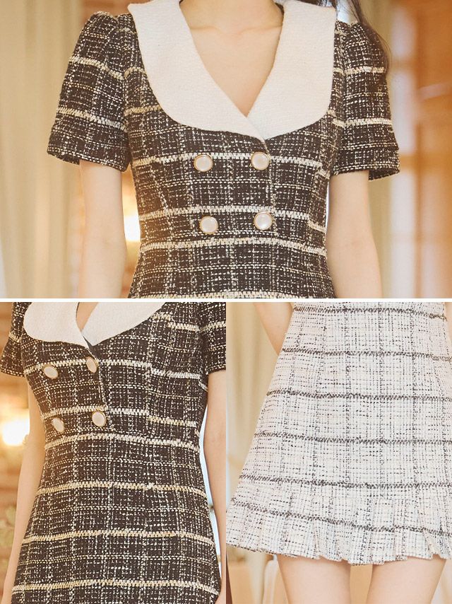 3. [JENNNY/ジェニー] チェック柄 ツイード 襟付き ボックスプリーツ 半袖 フレアミニドレス