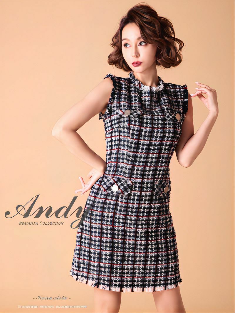 キャバドレス Andy アンディ 高級ツイードレトロチェック柄フロントボタンワンピースノースリーブタイトミニドレス