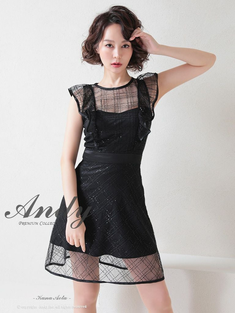 キャバドレス Andy アンディ 高級ノースリーブチェック柄チュールフリルデザインスパンコールフレアミニドレス