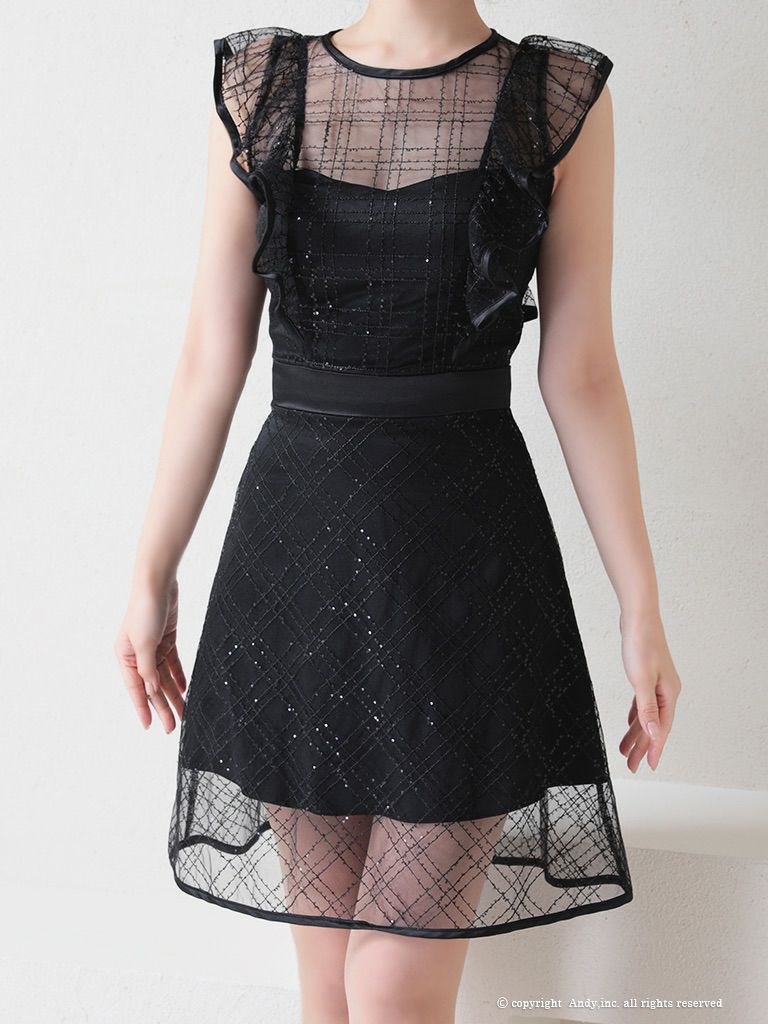 スパンコールが煌めく☆ [Andy/アンディ] 高級ノースリーブチェック柄チュールフリルデザインスパンコールフレアミニドレス