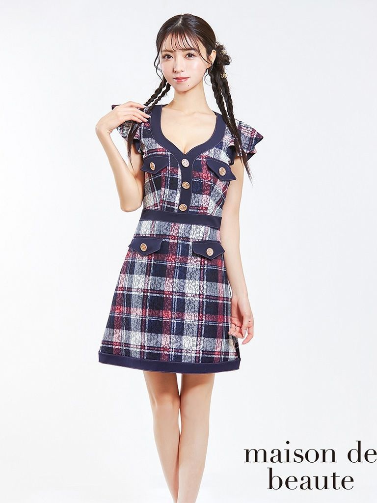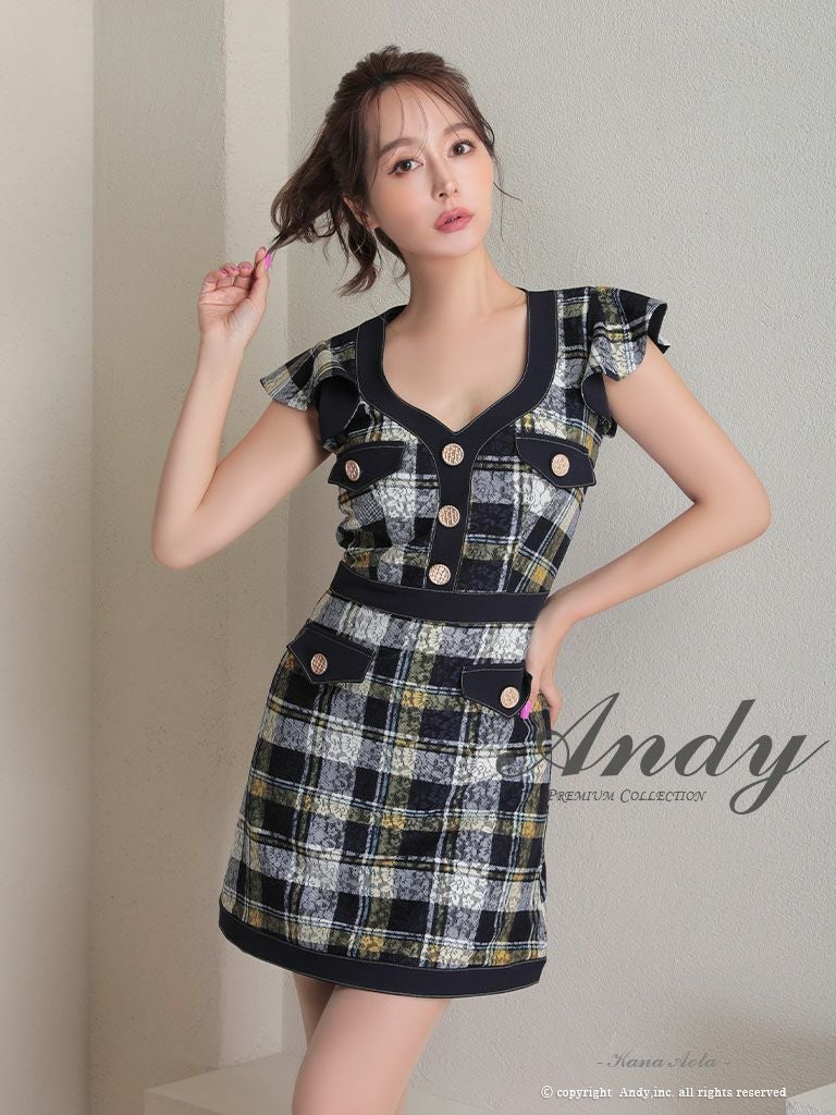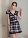 キャバドレス Andy アンディ 高級ガーリーチェック柄フリル袖ノースリーブフレアミニドレス