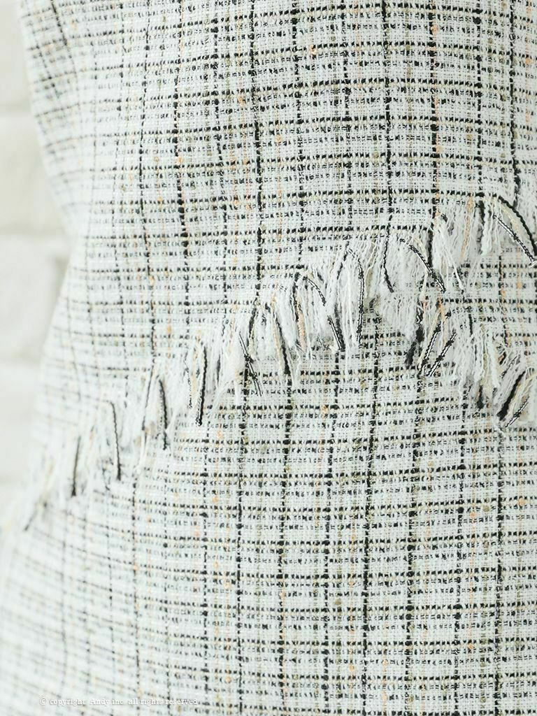 4. [Andy/アンディ] 高級 ノースリーブ ゴールドボタン ツイード フリンジチェック柄 アシメフレアミニドレス