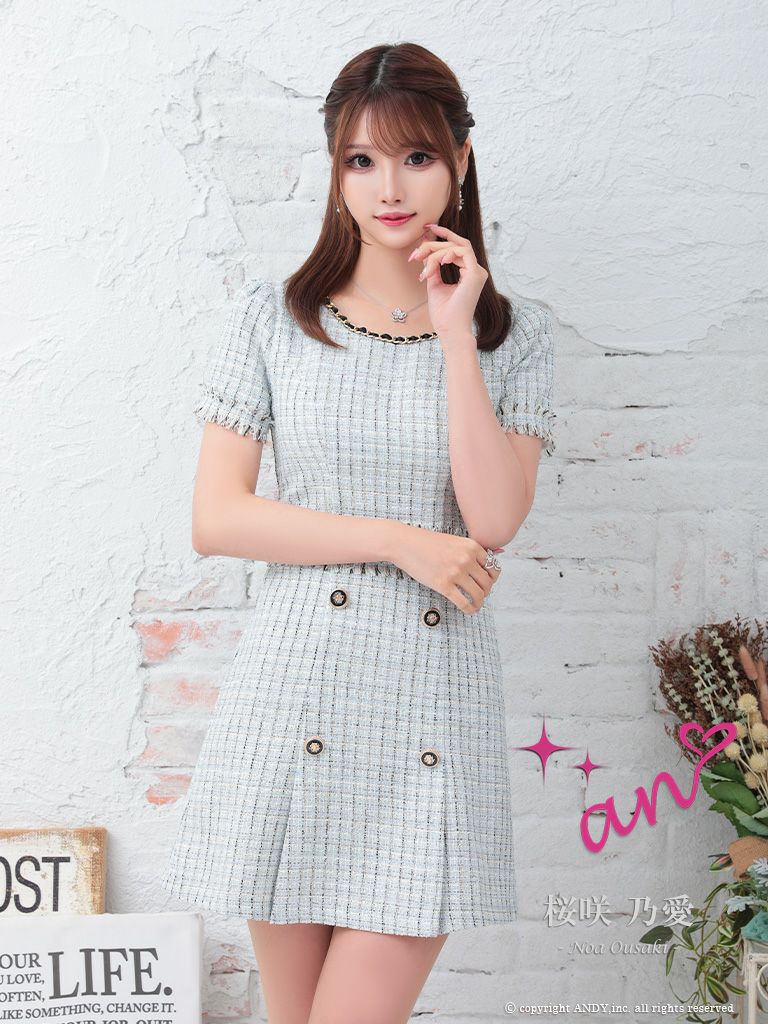 キャバドレス an アン 高級半袖チェック柄ツイードボタンチェーンフレアミニドレス