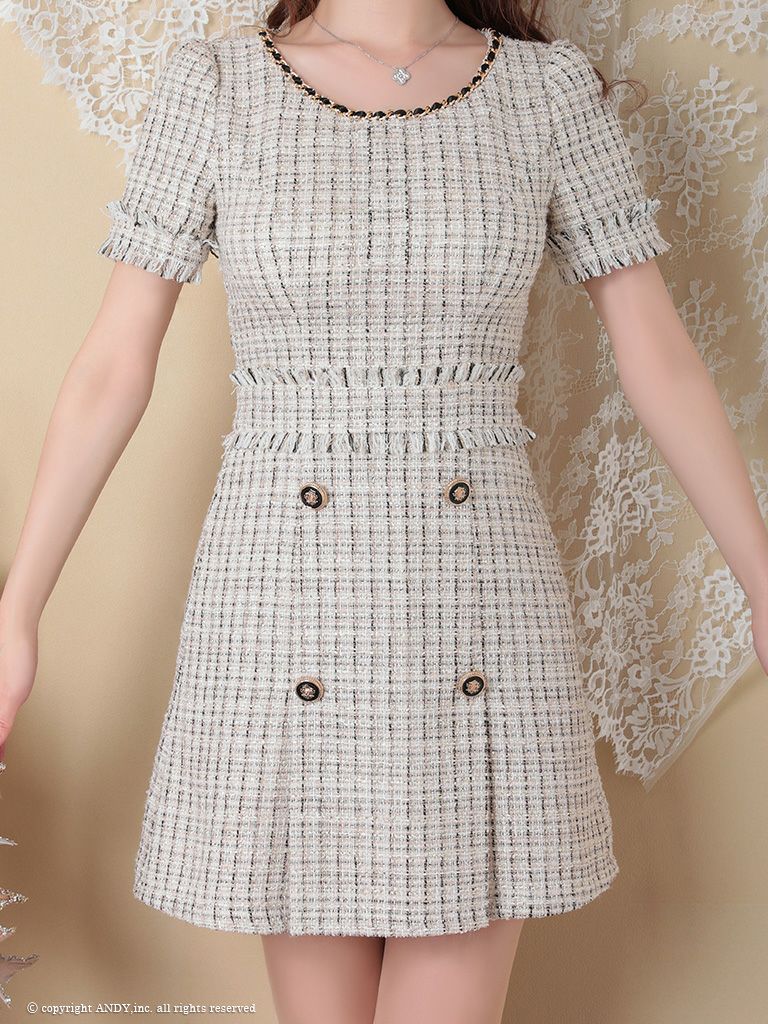 シンプルなデザインが魅力的☆ [an/アン] 高級半袖チェック柄ツイードボタンチェーンフレアミニドレス