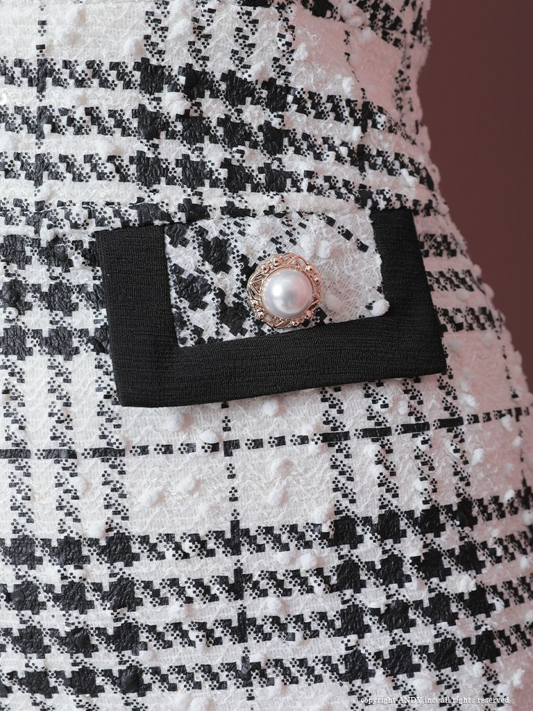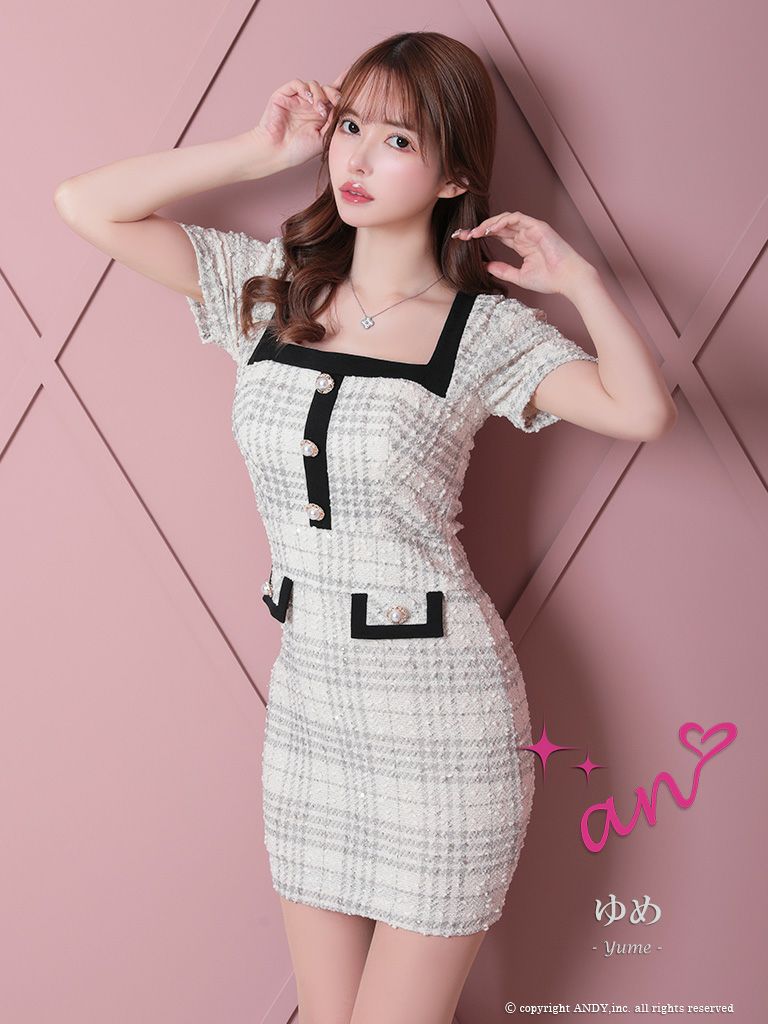 4. [an/アン] 高級パールボタンチェック柄半袖ウエストマークミニタイトドレス