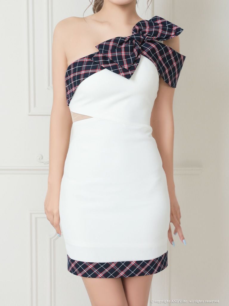 縁取りチェックデザインで大人可愛い☆ [an/アン] 高級ワンショルダー肩出し 二の腕カバーチェック柄タイトミニドレス