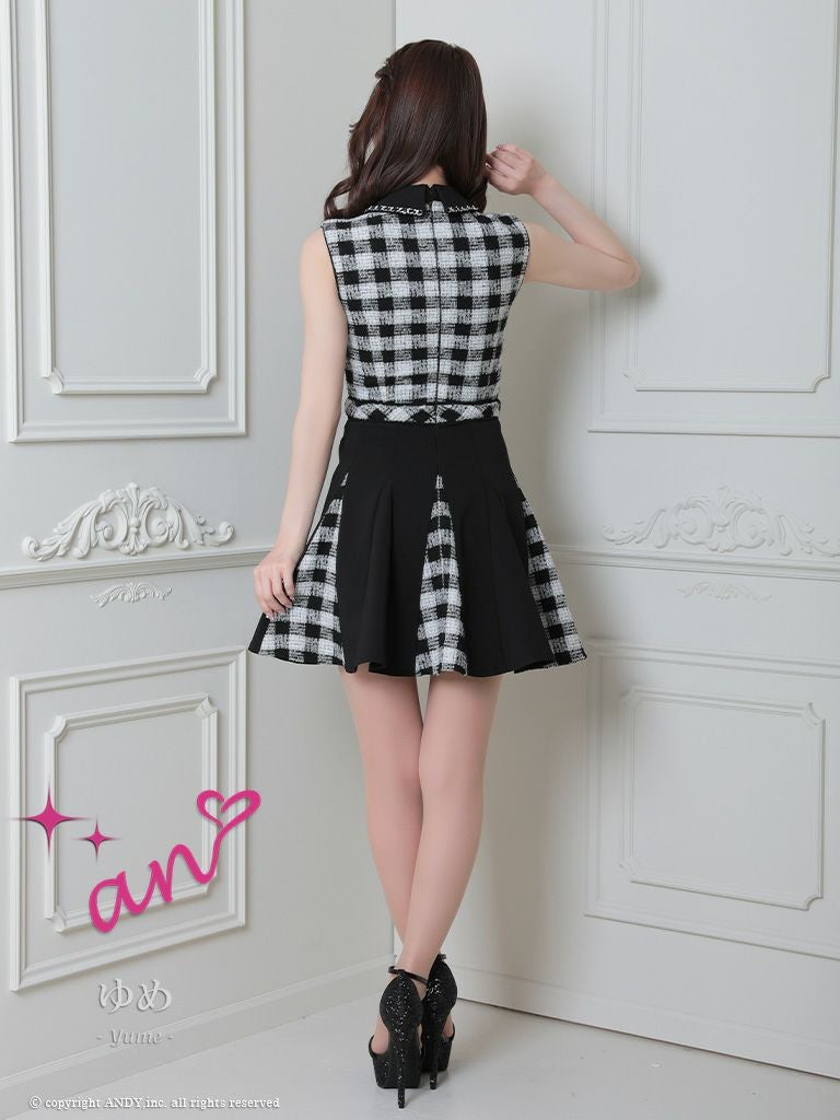 5. [an/アン] 高級 チェック柄 ツイード 襟付き ジップ ノースリーブ フレアミニドレス