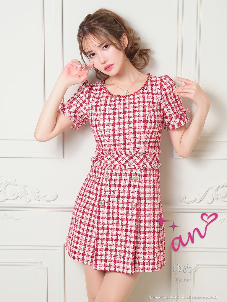キャバドレス Andy アンディ 高級チェック柄ボートネックツイード半袖フレアミニドレス