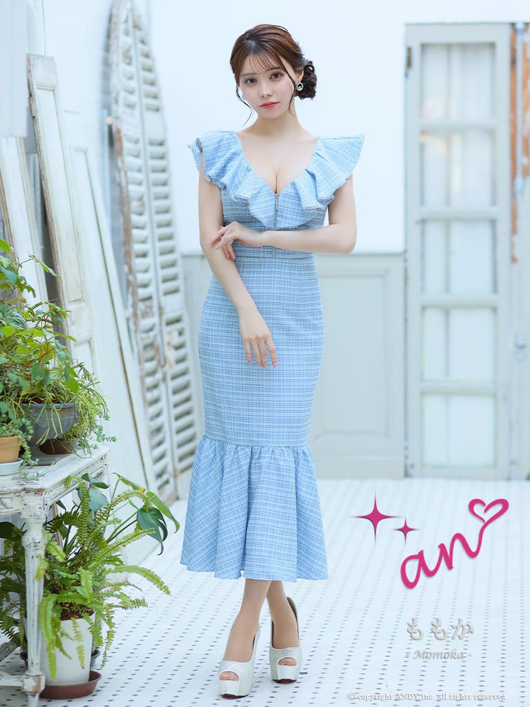 キャバドレス ロングドレス an アン 高級チェック柄フロントジップ胸元フリルノースリーブマーメイドロングドレス