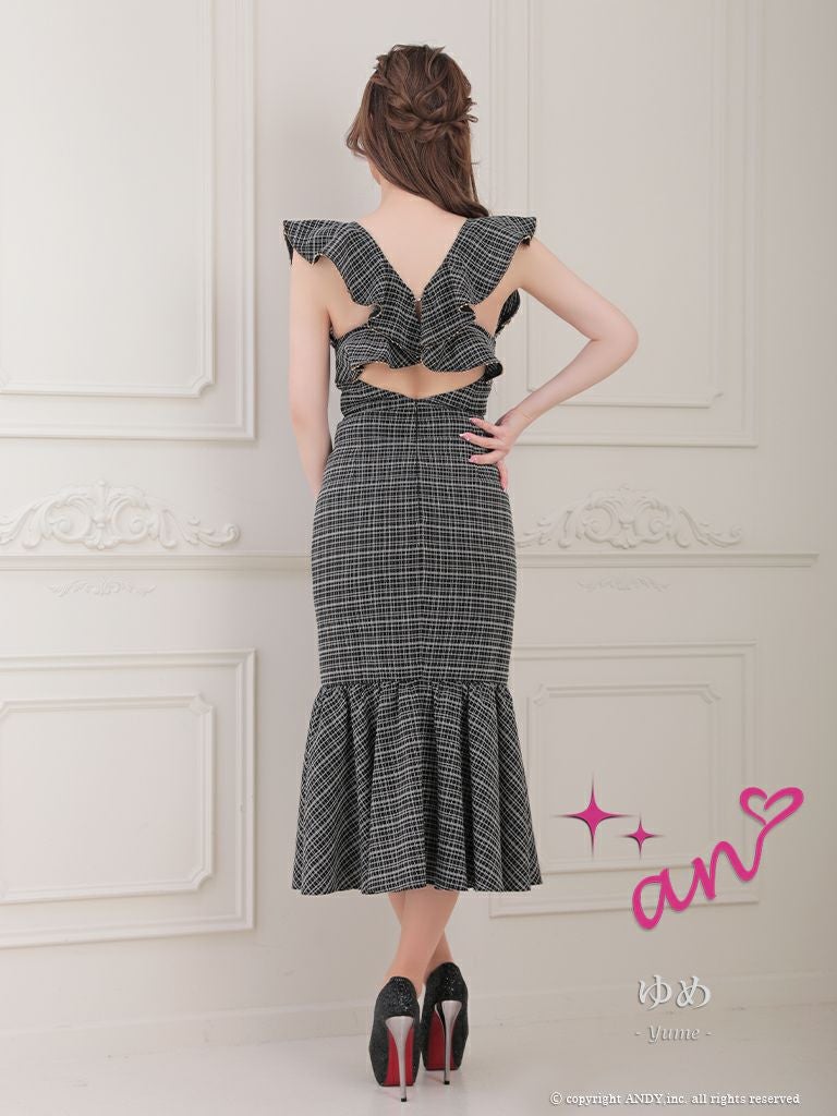 程良い背中見せでセクシーに☆ [an/アン] 高級チェック柄 フロントジップ 胸元フリル ノースリーブ マーメイドロングドレス