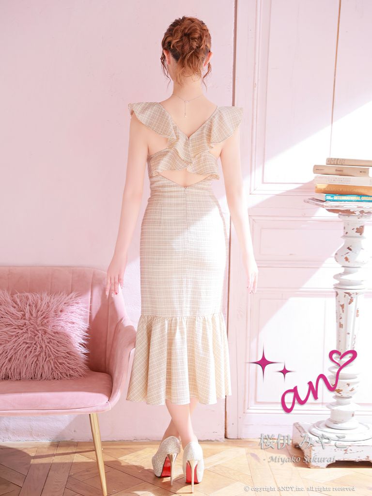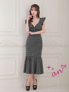 キャバドレス ロングドレス an アン 高級チェック柄フロントジップ胸元フリルノースリーブマーメイドロングドレス