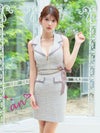 4. [an/アン] 高級 襟付き フロントジップ チェック柄 ツイード チェーンベルト サイドリボン ノースリーブ タイトミニドレス
