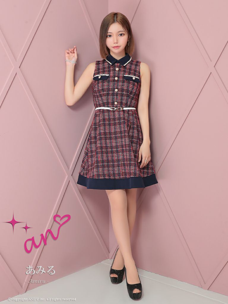 キャバドレス an アン 高級ノースリーブ襟デザインパールボタンウエストベルトツイードチェック柄フレアミニドレス