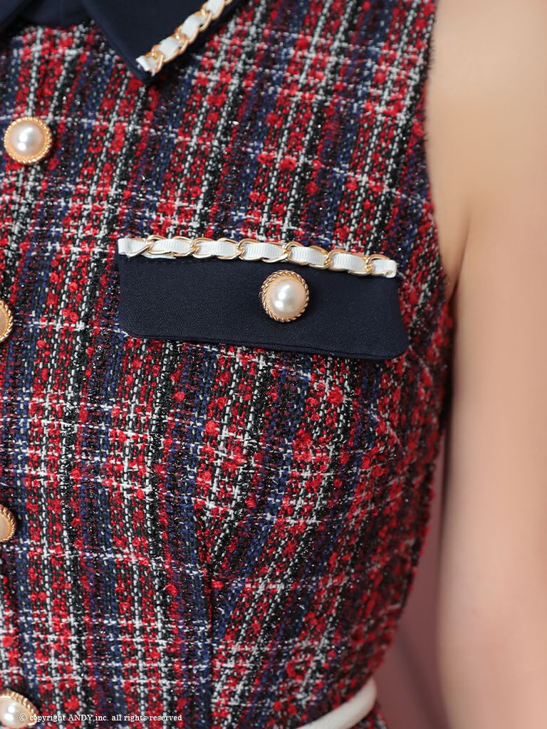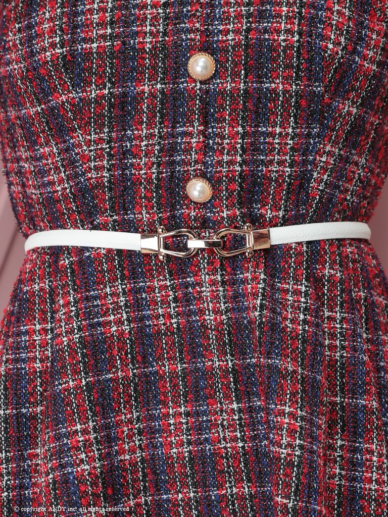 5. [an/アン] 高級 ノースリーブ 襟付き パールボタン ウエストベルト ツイード チェック柄 フレアミニドレス