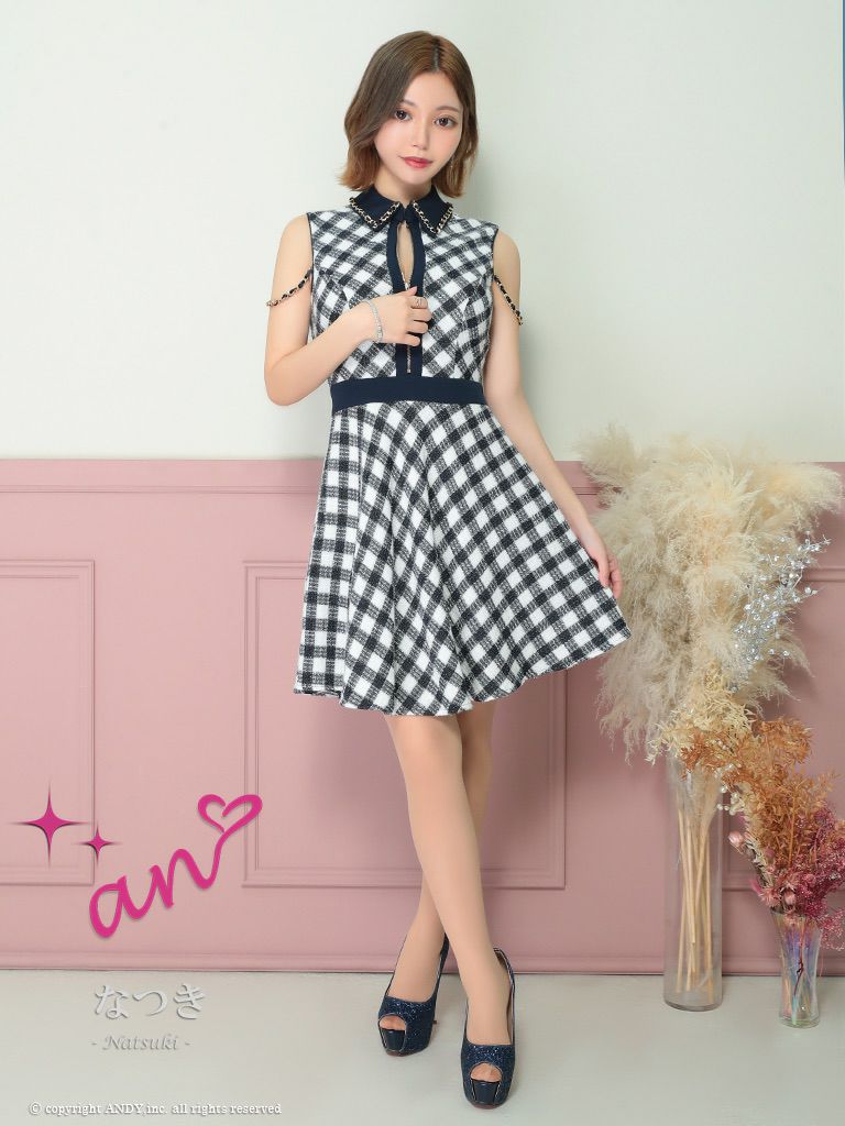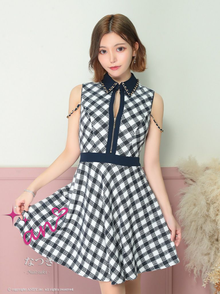 キャバドレス an アン 高級チェック柄ノースリーブ襟デザインジップチェーン膝丈ドレス