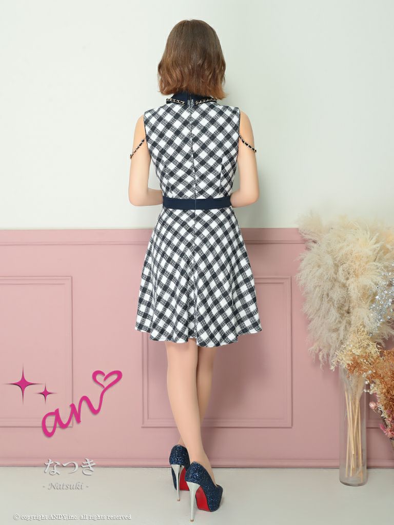 キャバドレス an アン 高級チェック柄ノースリーブ襟デザインジップチェーン膝丈ドレス