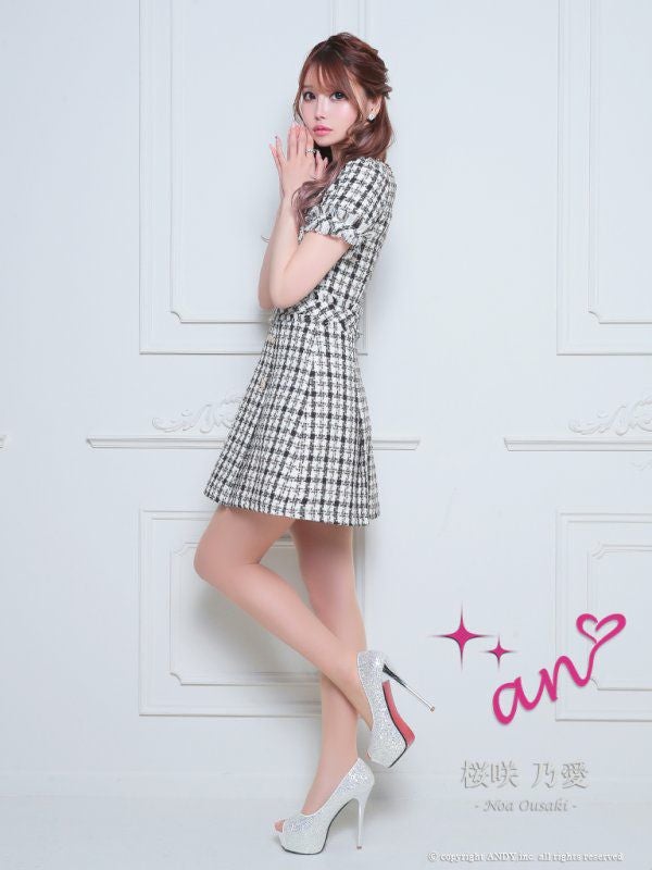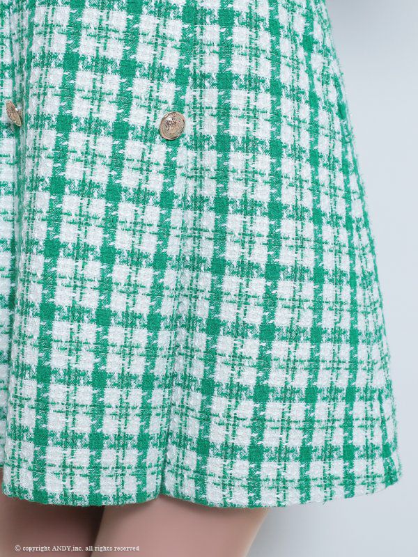 5. [an/アン] 高級チェーンネック半袖ツイードチェック柄ダブルボタンボックスフレアミニドレス