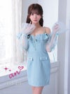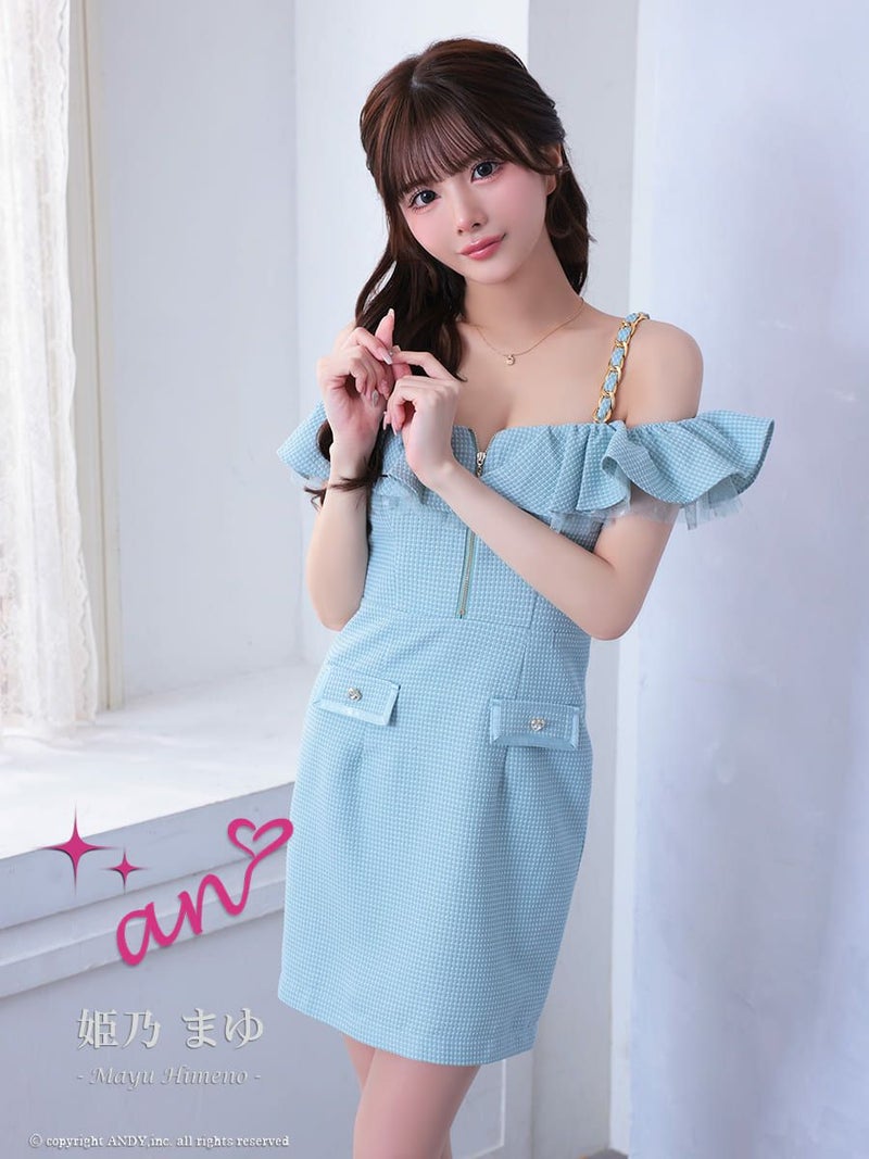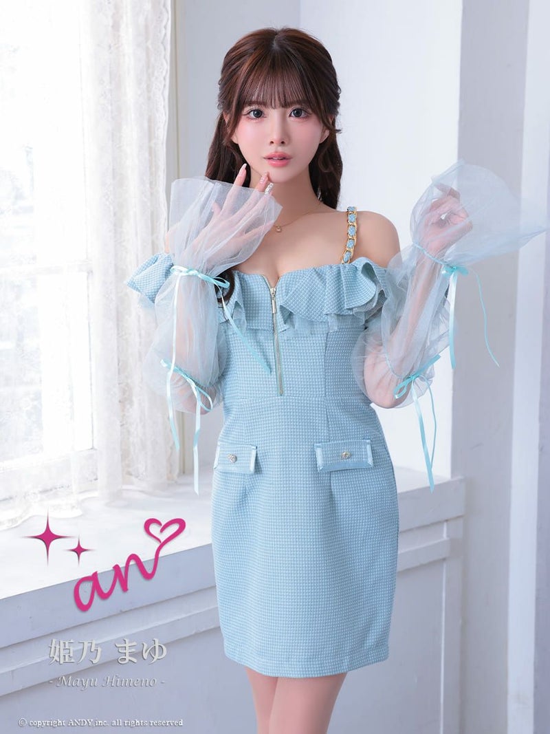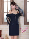 キャバドレス Andy アンディ 高級 キャミソール 肩あき チェック ジップデザイン ポケット フリル チュール袖 ビジュー タイトミニドレス