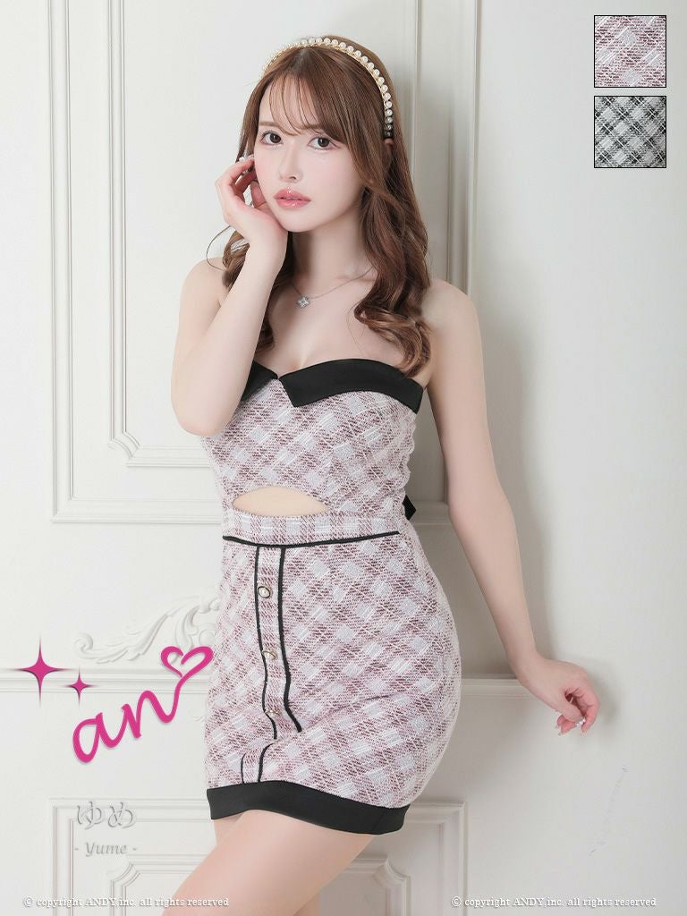 チェック柄とバックリボンで女の子らしさを演出♡ [an/アン] 高級 ブランド タイト ミニドレス ベアトップ チェック柄 ウエストカット 襟付き バックリボン ボタン