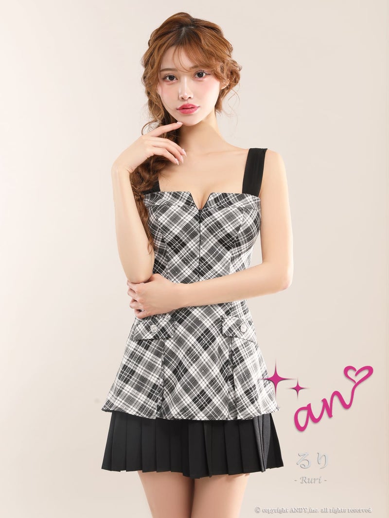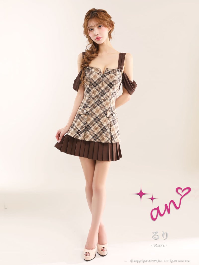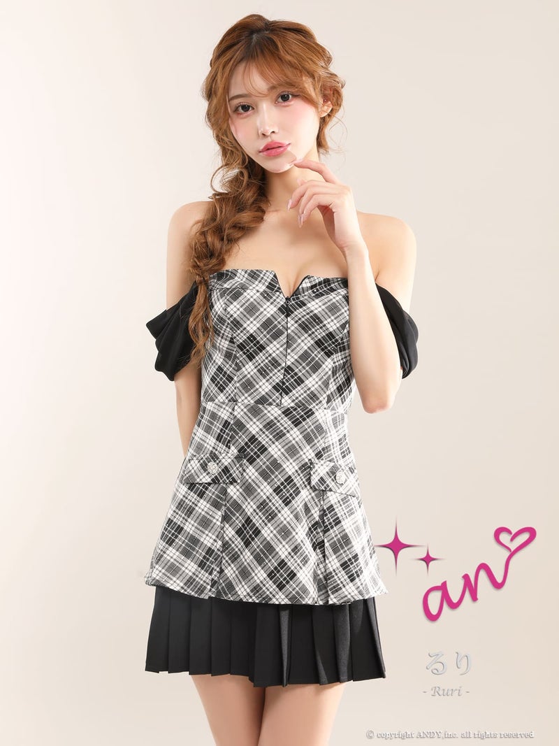 キャバドレス an アン 4way オフショルダー フレアミニドレス バストカット ジップ バイカラー チェック柄 フリル