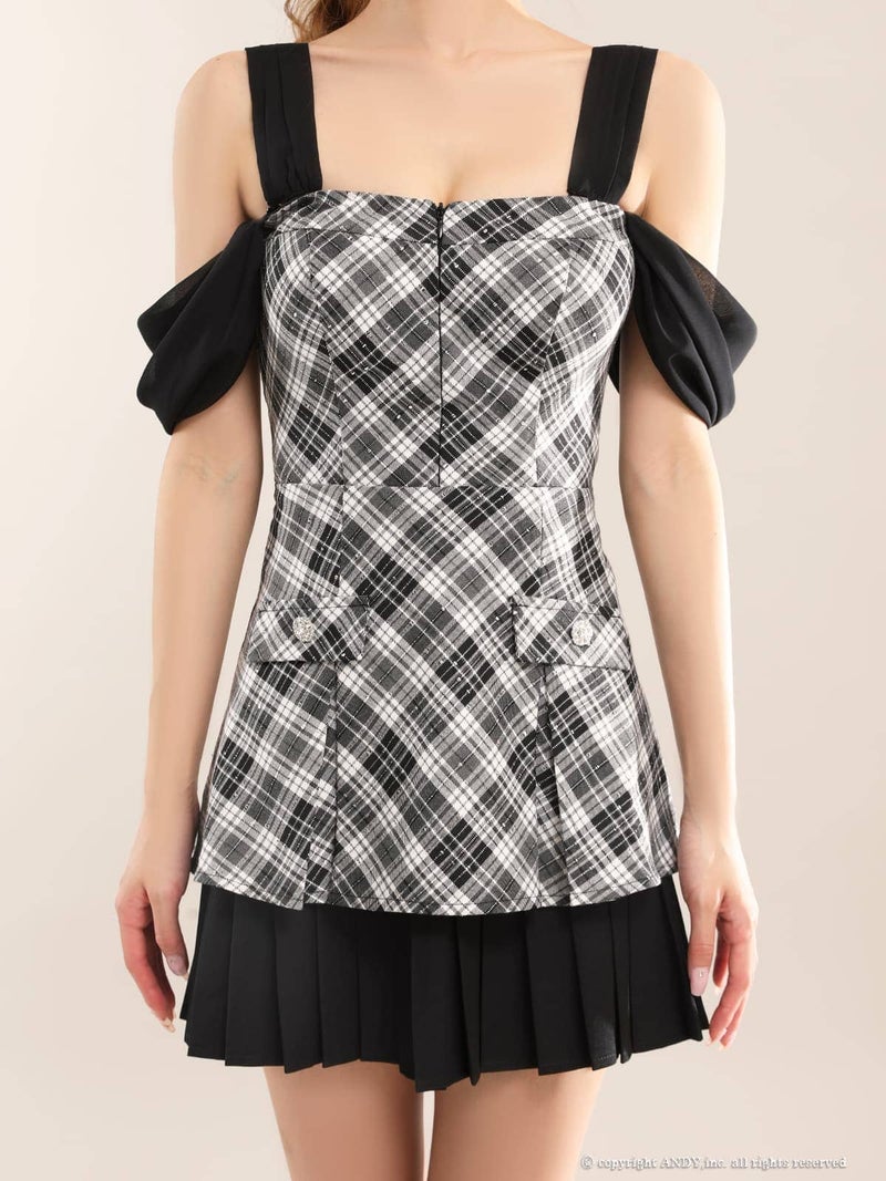 5. [an/アン] 高級 4way オフショルダー フレアミニドレス バストカット ジップ バイカラー チェック柄 フリル