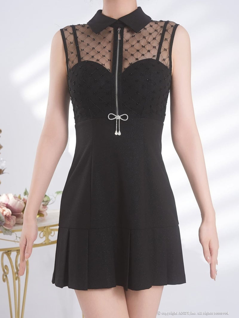 同伴にも使用できる品のあるドレス♡ [an/アン] 高級 ノースリーブ フレアミニドレス バストカット ジップ リボン 襟付き プリーツ