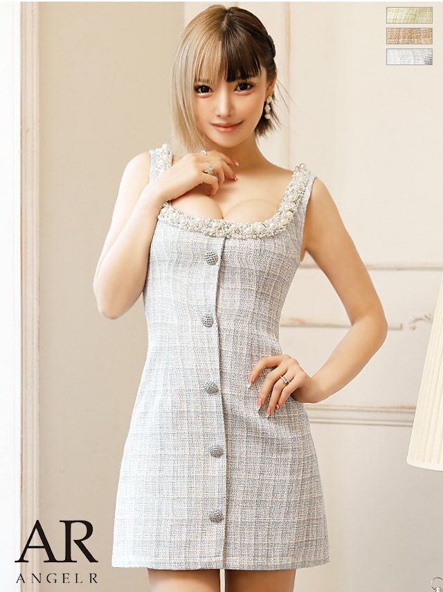 CUTEなワンピース風デザイン☆ SALE [Angel-R/エンジェルアール] 高級バストパールビジューフロントボタンチェック柄ツイードノースリーブくびれフレアミニドレス