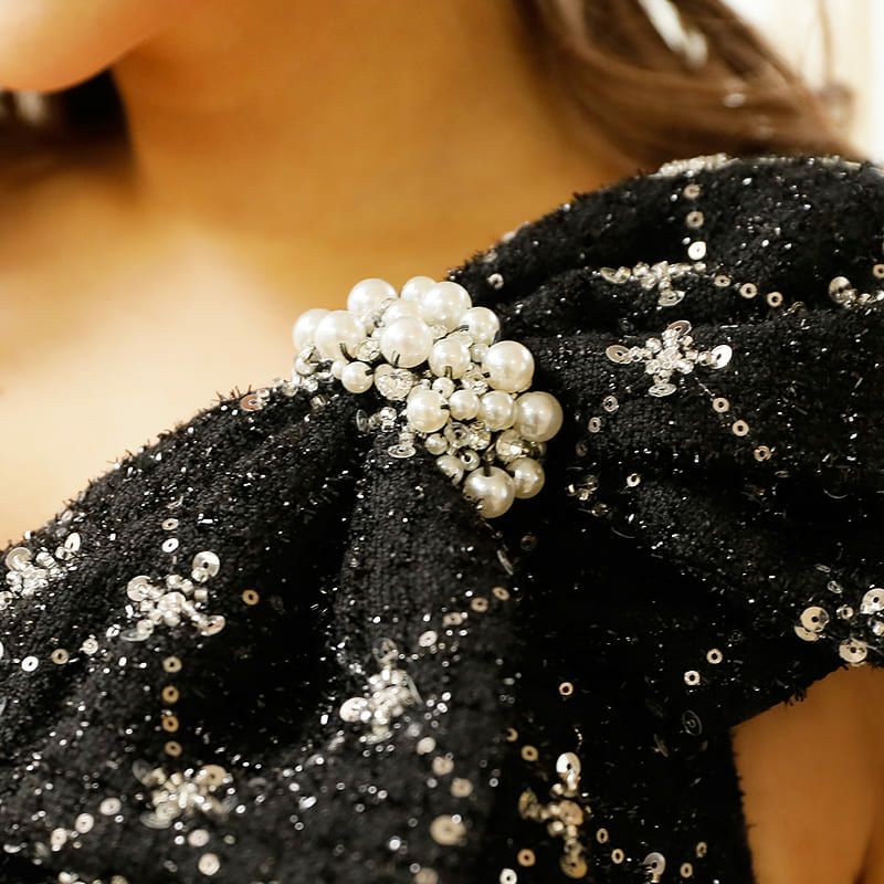 3. SALE [Angel-R/エンジェルアール] 高級ワンショルダーフロントリボンチェック柄スパンコールツイードフレアミニドレス