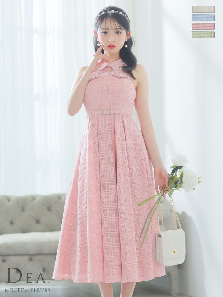 チェックシアーでガーリーな雰囲気に☆ [DEA.byROBEdeFLEURS/ディアバイローブドフルール] 高級 襟付き ホルターネック ウエストベルト チェック柄 シースルー Aラインロングドレス