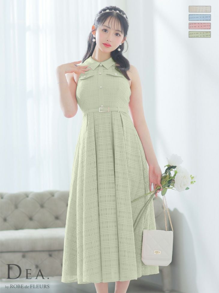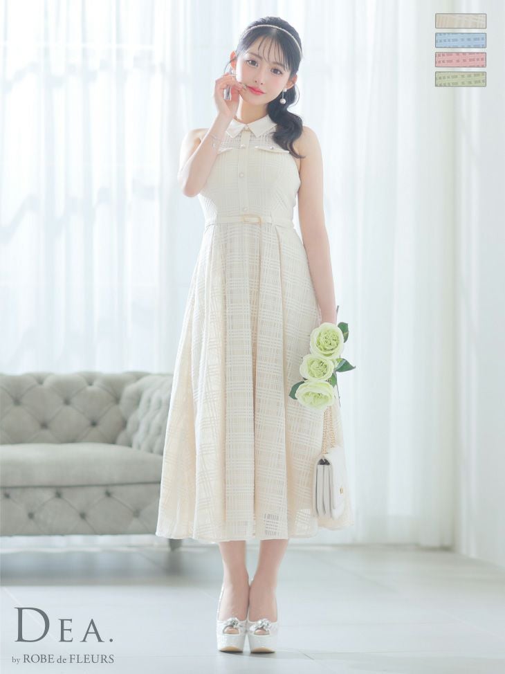 4. [DEA.byROBEdeFLEURS/ディアバイローブドフルール] 高級 襟付き ホルターネック ウエストベルト チェック柄 シースルー Aラインロングドレス