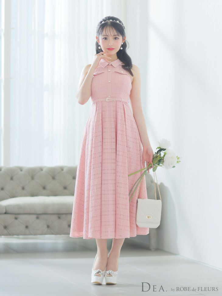 5. [DEA.byROBEdeFLEURS/ディアバイローブドフルール] 高級 襟付き ホルターネック ウエストベルト チェック柄 シースルー Aラインロングドレス