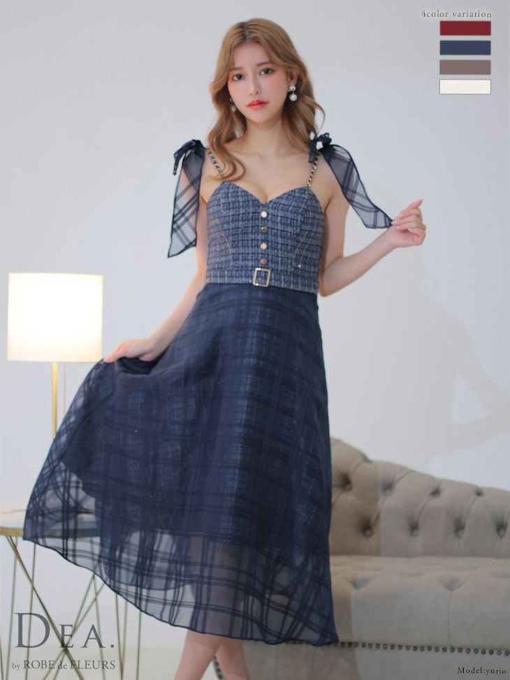 4. [DEA.byROBEdeFLEURS/ディアバイローブドフルール] 高級ラメツイードキャミソールチェック柄オーガンジーワンピースAラインロングドレス