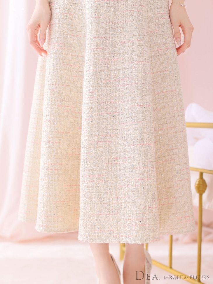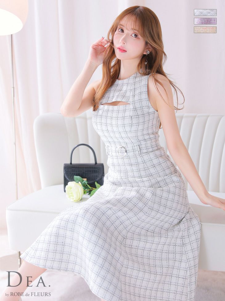 スプリングツイード生地を使ったガーリードレス☆ SALE [DEA.byROBEdeFLEURS/ディアバイローブドフルール] 高級 ノースリーブ バストカット ウエストベルト チェック柄 ツイード 谷間魅せ Aラインロングドレス
