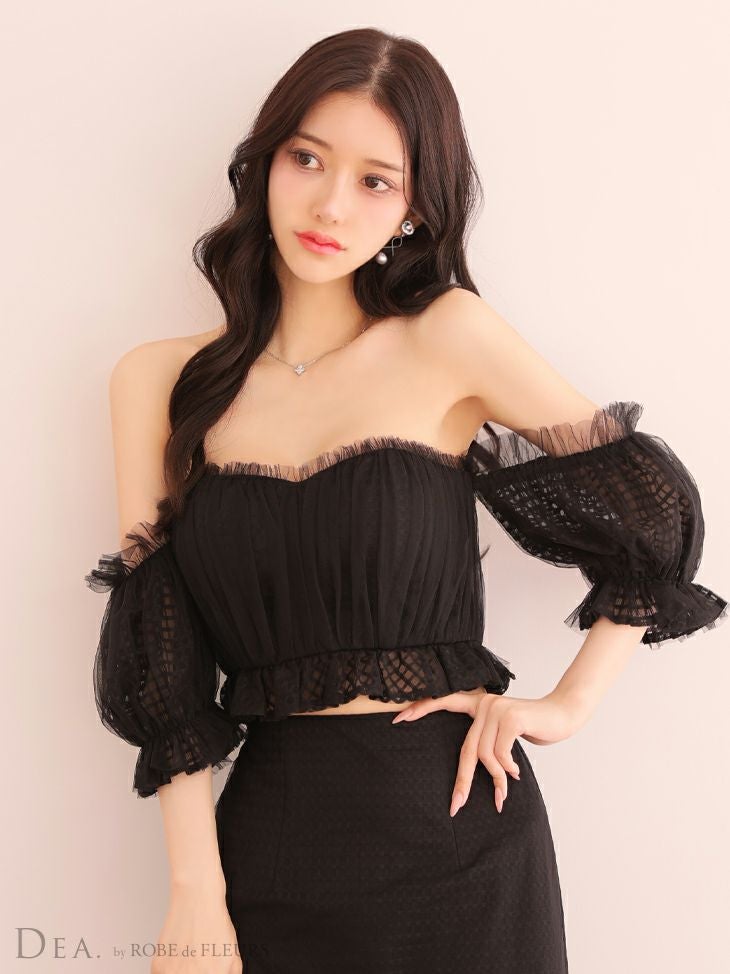 ドレッシーな雰囲気漂う☆ [DEA.byROBEdeFLEURS/ディアバイローブドフルール] 高級オフショルダーチェック柄マーメイドフリルセットアップタイトロングタイトドレス