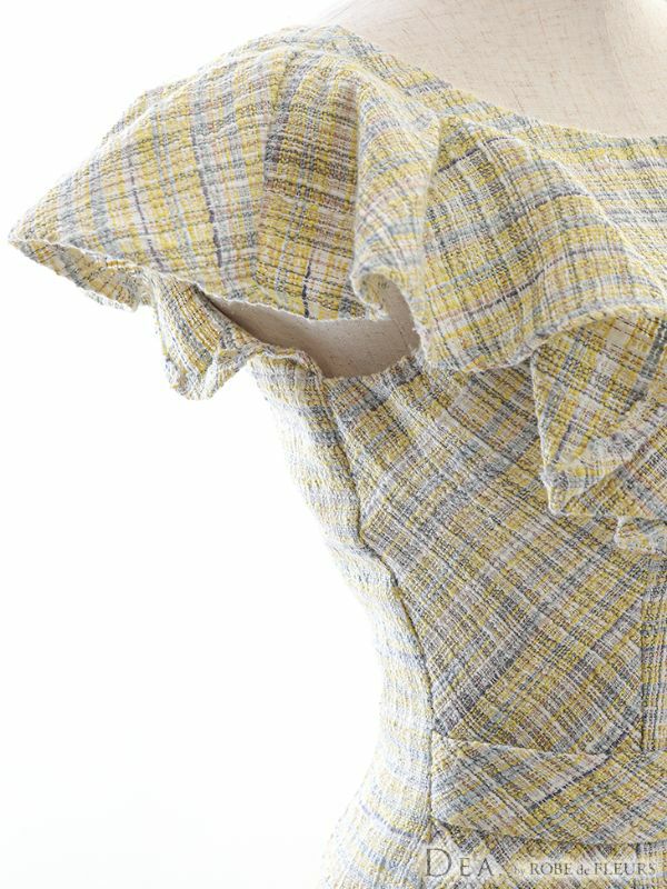 4. [DEA.byROBEdeFLEURS/ディアバイローブドフルール] 高級アシンメトリーフリル袖ウエストマークツイードチェック柄ノースリーブタイト膝丈ドレス