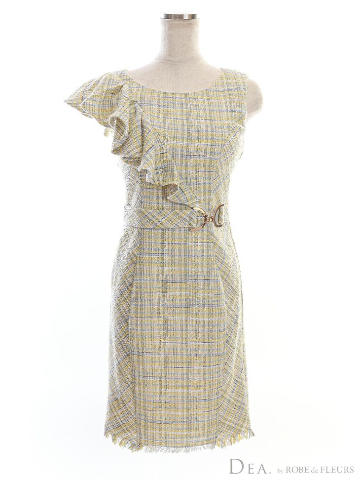 DEA.byROBEdeFLEURS ディアバイローブドフルール 高級アシンメトリーフリル袖ウエストマークツイードチェック柄ノースリーブタイト膝丈ドレス