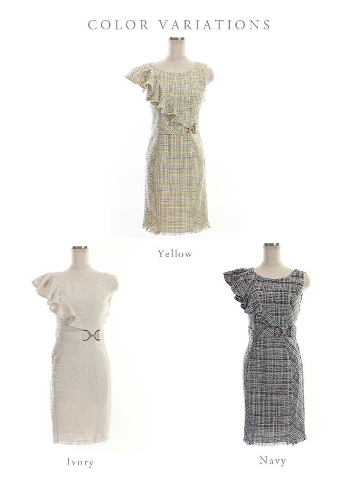 3. [DEA.byROBEdeFLEURS/ディアバイローブドフルール] 高級アシンメトリーフリル袖ウエストマークツイードチェック柄ノースリーブタイト膝丈ドレス