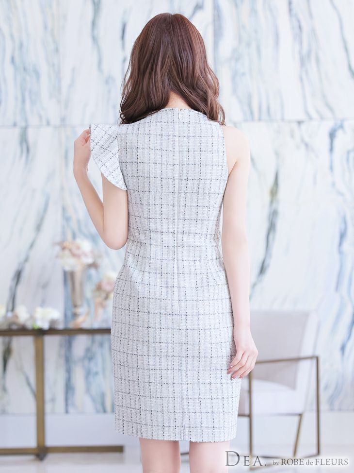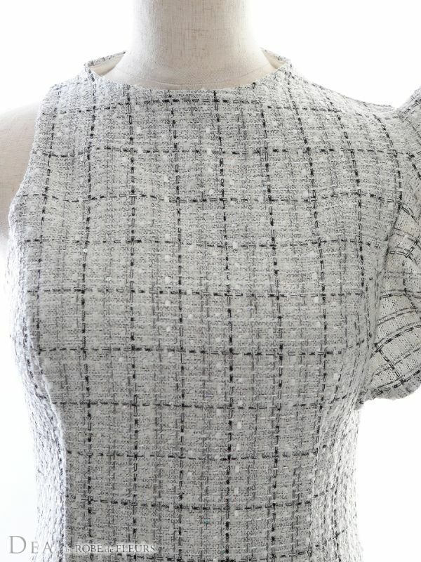 ツイードが可愛く上品なタイトミニドレス☆ [DEA.byROBEdeFLEURS/ディアバイローブドフルール] 高級チェック柄ツイード×アシンメトリーノースリーブタイトミニワンピースドレス