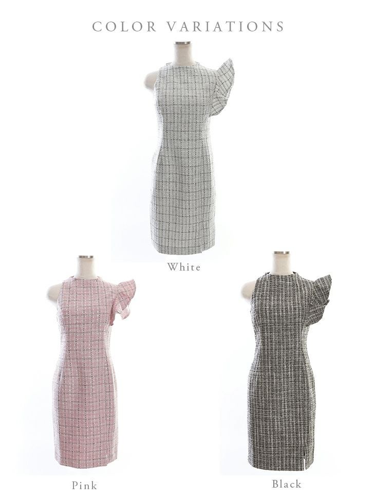 3. [DEA.byROBEdeFLEURS/ディアバイローブドフルール] 高級チェック柄ツイード×アシンメトリーノースリーブタイトミニワンピースドレス